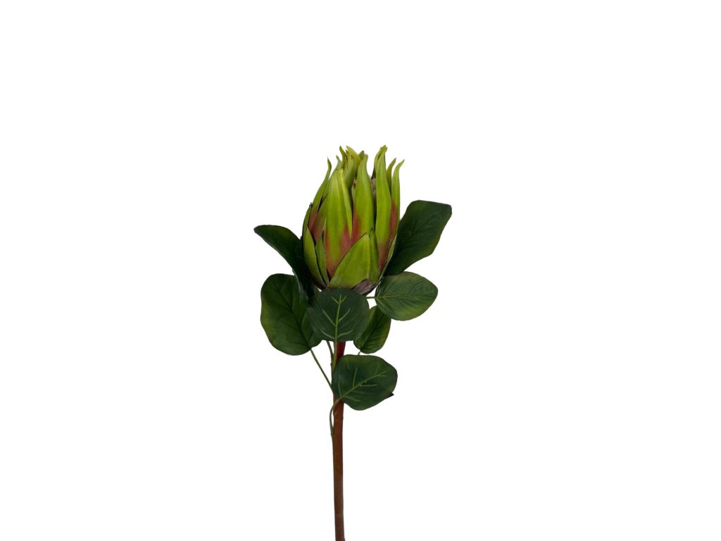 Umělá květina protea o délce 68 cm v zeleném provedení s jemným červeným tónováním. Výrazná exotická dekorace s moderním a svěžím vzhledem.