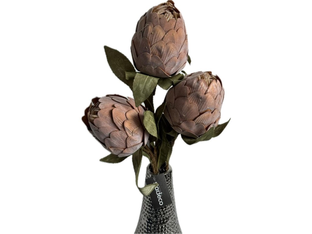 Dekorativní umělá protea (Protea cynaroides) o délce 63 cm zaujme svými pevnými, vrstvenými květy v přírodních hnědých tónech. Charakteristický šišticovitý tvar a strukturované okvětní lístky dodávají květině výrazný a originální vzhled inspirovaný exotickou přírodou.