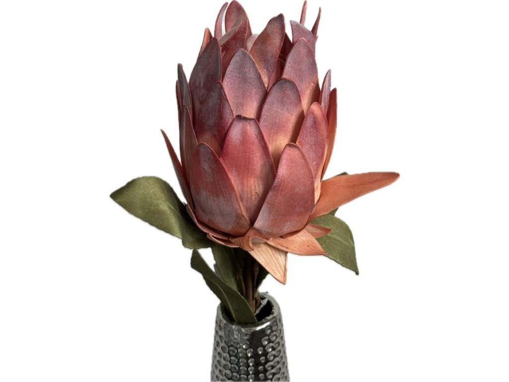 Dekorativní umělá protea (Protea cynaroides) o délce 63 cm zaujme svým charakteristickým šišticovitým květem s pevnými, vrstvenými okvětními lístky. Barevnost se pohybuje v teplých korálových a starorůžových tónech s jemným přechodem do tmavších odstínů, což dodává květině hloubku a luxusní vzhled.
