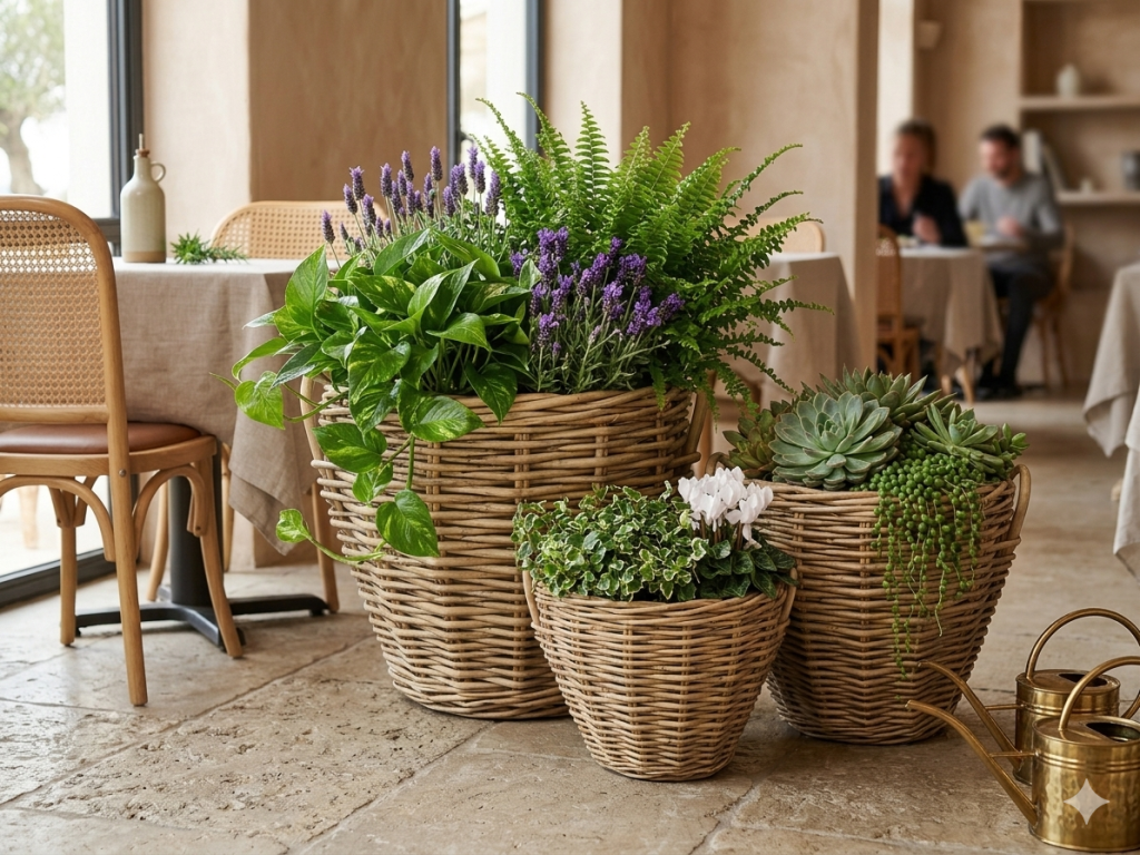 Proutěný koš s uchem a igelitovou výstelkou v přírodním stylu je ideální pro osázení květin i dekorativní aranžmá.
