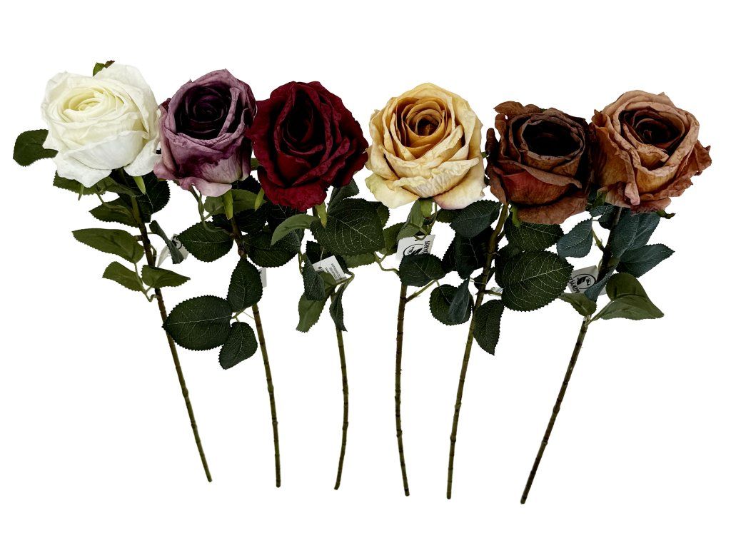 Jednohlavá růže DRY v mixu barev zaujme svým jedinečným vzhledem inspirovaným sušenými květinami. Každý kus má originální barevné provedení, které dodává dekoraci osobitý a lehce patinovaný charakter.