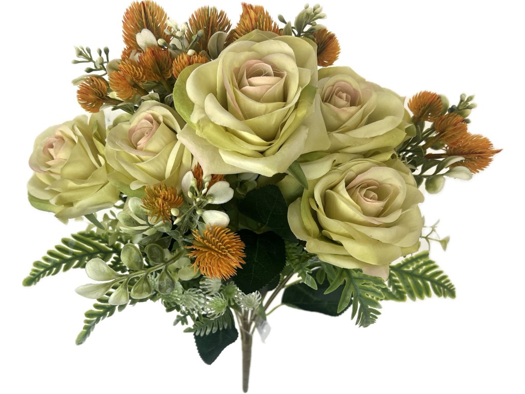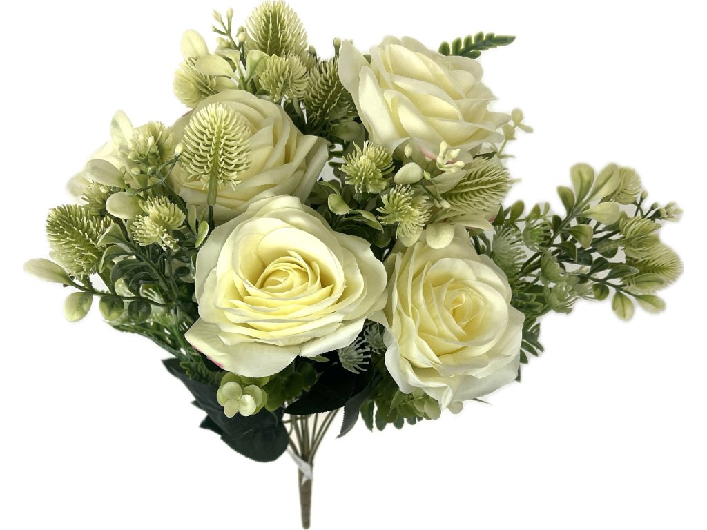 Růže puget 6 hlav s bodláky a kapradím 50 cm, MIX barev