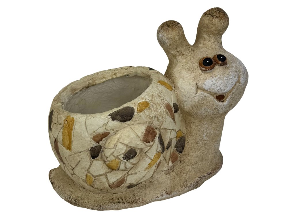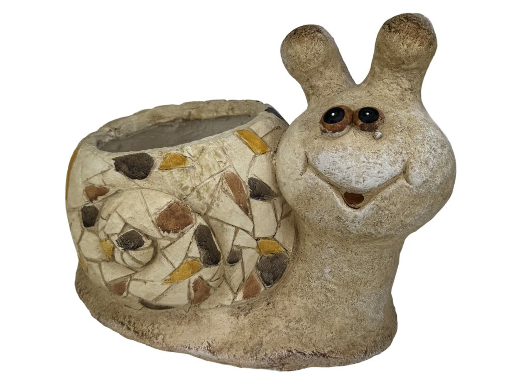 Zahradní květináč ve tvaru roztomilého šneka s mozaikovým zdobením. Originální dekorace z magnesium vhodná pro venkovní použití.