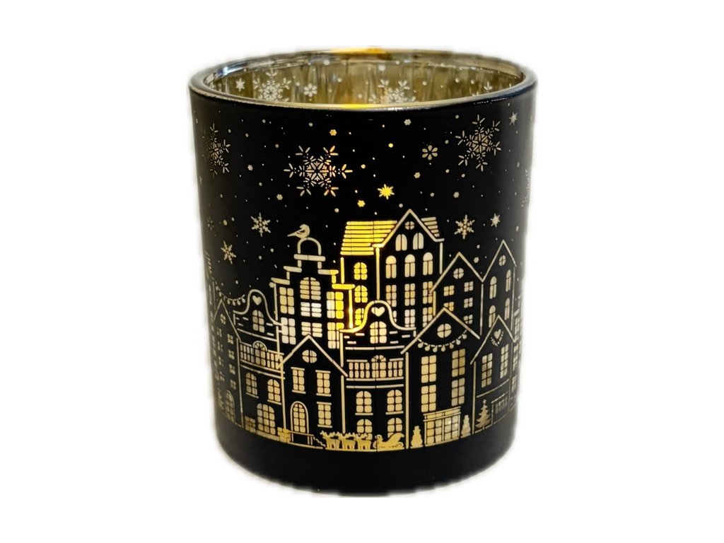 Svícen na čajovou svíčku černý 7x8 cm, vzor domy a vločky