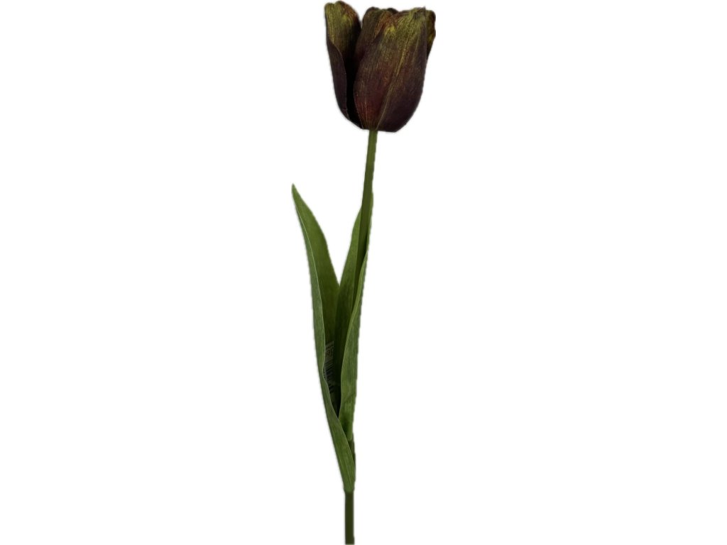 Umělý tulipán o délce 64 cm v tmavém vínovo-hnědém odstínu se zeleným tónováním. Elegantní a netradiční květina, která dodá aranžmá hloubku a výrazný charakter.