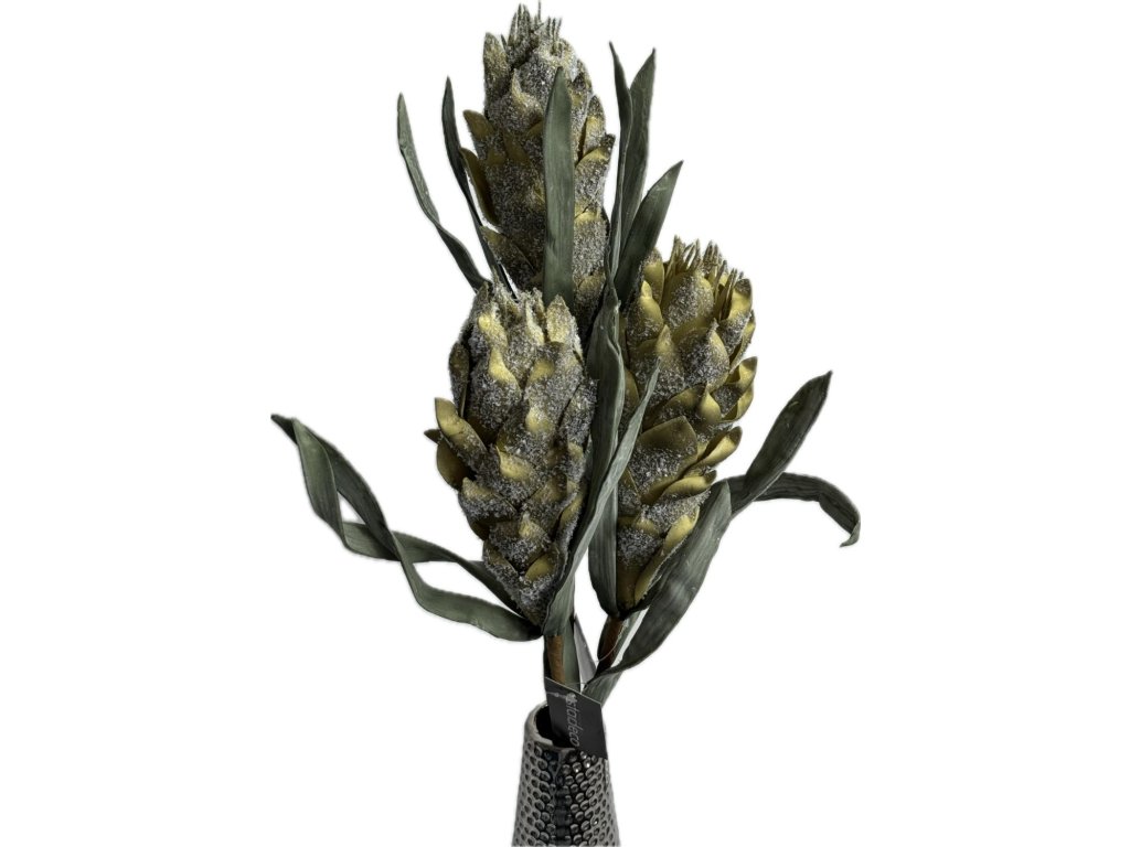 Dekorativní umělá květina zázvor (Zingiber) o délce 70 cm zaujme výrazným šišticovitým květenstvím v zelených tónech. Povrch je doplněn jemným bílým efektem, který dodává větvi zajímavou texturu a lehce zimní nádech.