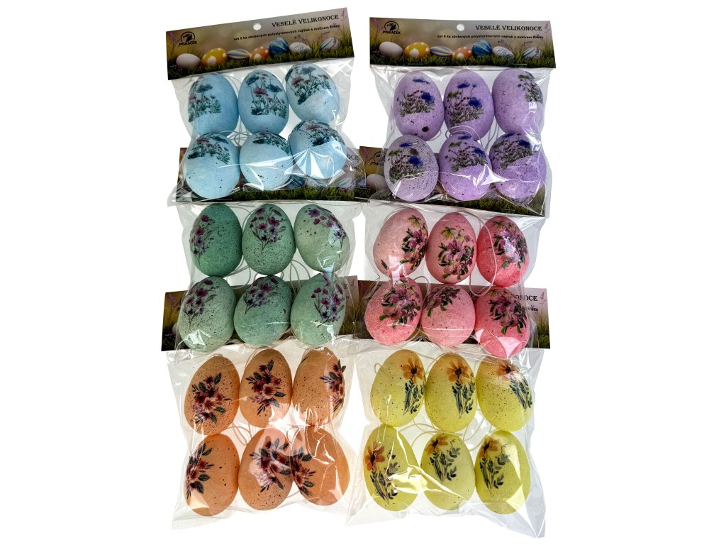 Dekorativní závěsná vajíčka zaujmou svým svěžím a hravým designem. Každé vajíčko je zdobené jemnými květinovými motivy a dostupné v různých pastelových i výraznějších barvách, které dodají vaší výzdobě život.