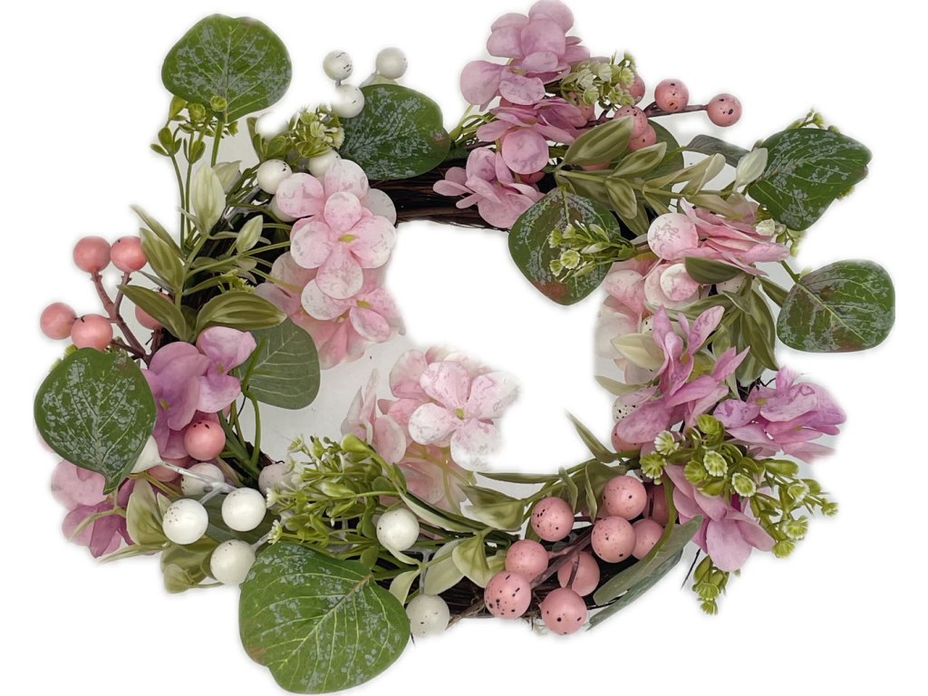 Věnec pr.27 cm s růžovými květy a eukalyptem