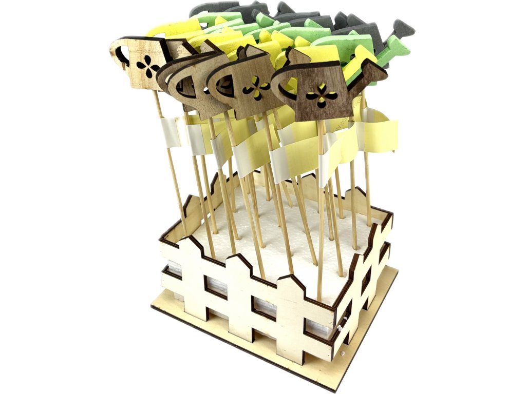 Zápich konev/kytička dřevěná 8x25 cm na špejli, mix barev ve stojánku